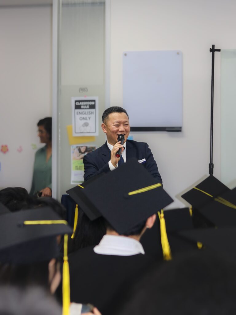 The graduation ceremony was filled with inspiring and memorable moments. It began with an inspirational keynote from AMCA Marketing Director, Mr. Min Park, who reminded students that “Education is not the end but the beginning of purpose.” The event featured cultural performances that showcased the diversity of the AMCA community, alongside candid photo moments shared between families and faculty. A graduation showcase video premiered, highlighting the most memorable experiences throughout the academic year. The ceremony concluded with a heartfelt slideshow featuring then-and-now photos of the graduating students, capturing the journey they had taken together.